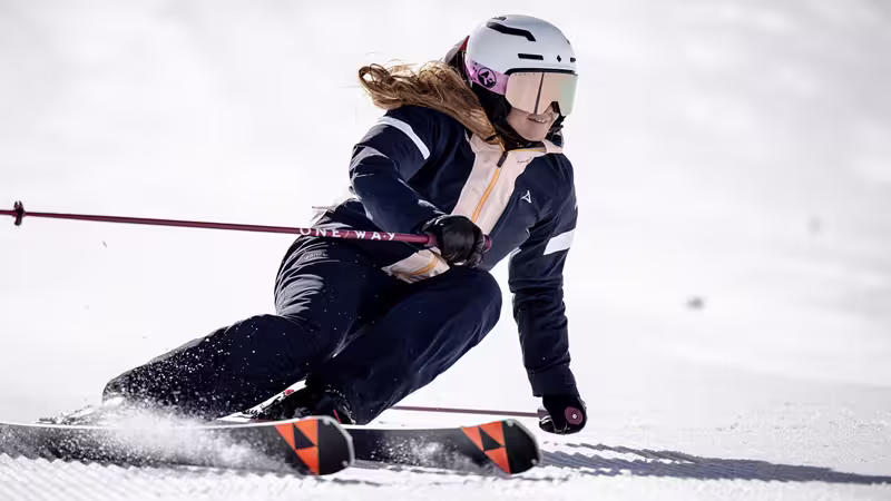 Eine individuelle Ausrüstung zum Skifahren von Skiern und Stöcken, Helm und Outfit kostet Geld.