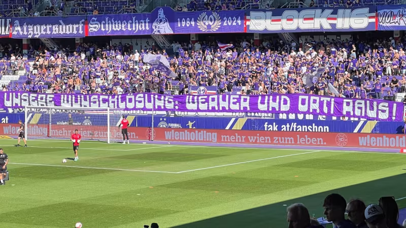 Schon vor dem Start ins erste Meisterschaftsspiel in der Generali Arena gegen den Wolfsberger AC (LIVE-Ticker >>>) hängt auf der Osttribüne, wo die Fanszene der Violetten beheimatet ist, ein großes Transparent mit einer Ablöseforderung.