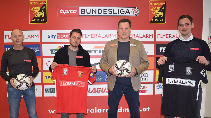 Im Bild von links nach recht bei der Präsentation des ÖFB-Rekordspielers: Jochen Seuling (Leiter Strategie und Entwicklung Flyeralarm), Marcel Ketelaer (Sportdirektor), Andreas Herzog (Trainer), Thomas Drabek (Geschäftsführer).
