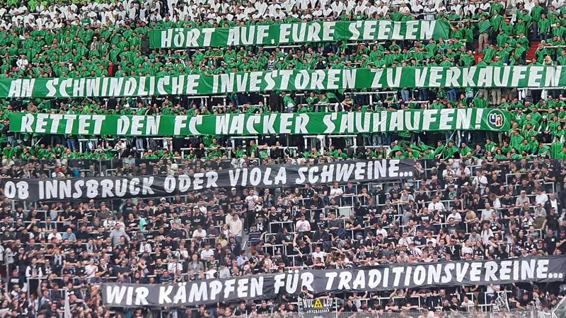 Im Rapid-Sektor wurden dann Banner mit der passenden Aufschrift entrollt: "Hört auf, eure Seelen an schwindliche Investoren zu verkaufen, rettet den FC Wacker Sauhaufen!" Sowohl die Tiroler als auch die Austria kämpfen derzeit um die Lizenz und den Verbleib im Profi-Fußball, vor allem 2. Liga-Klub Wacker ist mit drei Investoren in den vergangenen zwei Jahren gleich mehrfach ins Fettnäpfchen getreten.