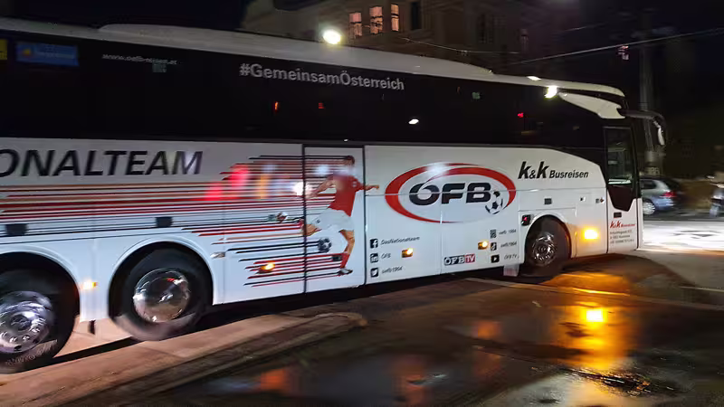 Die Erstaunung bei LAOLA1 war groß, deshalb entstand auch dieser Schnappschuss (siehe Bild). Denn niemand geringerer als Rapid-Gegner Vitesse Arnheim im Playoff der Conference League (Endstand: 1:2/Spielbericht >>>) wurde zum und vom Stadion weg mit dem fahrbaren Untersatz des österreichischen Nationalteams befördert.