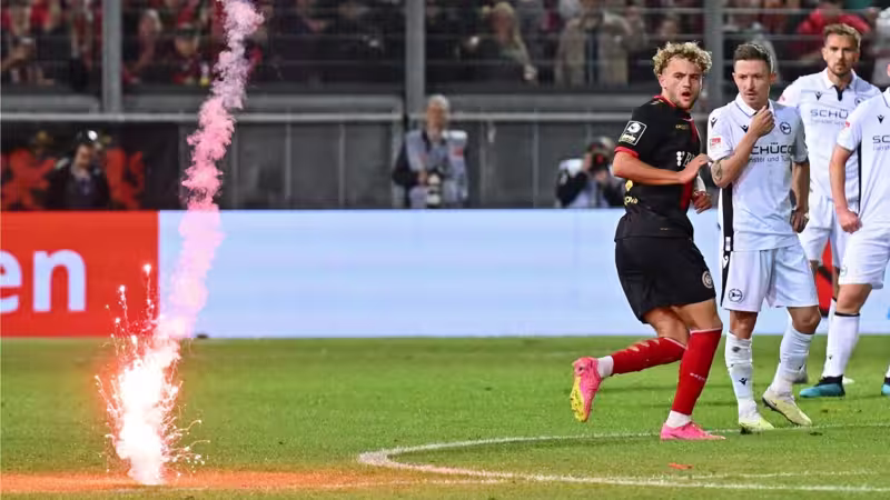 Erst nach einer minutenlangen Unterbrechung wird die Partie fortgesetzt, Bielefeld-Legende Fabian Klos konnte die eigenen Fans zuvor beruhigen, ehe nach Schlusspfiff wieder Feuerwerkskörper auf das Feld flogen.