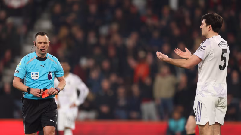 Harry Maguire verursacht spät einen Elfmeter, der zum Ausgleich führt, und fliegt mit Rot vom Platz.
