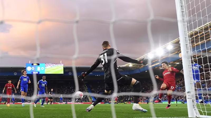 Nach einem Konter landet der Ball in Minute 33 am rechten Sechzehnereck bei Mohamed Salah, der Mittelfeld-Motor Curtis Jones mit einer butterweichen Flanke in Szene setzt - der 22-Jährige überwindet Leicester-Tormann Iversen und erzielt das 1:0.
