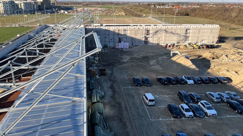 Der Rohbau steht, die Dachkonstruktion der Gebäude ist errichtet.