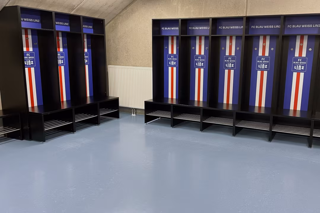 Erste Station: das „Ankleidezimmer“ der Blau-Weißen. Schlicht, funktional und in den Traditionsfarben des Vereins gehalten, reihen sich hier die Spinds von Ronivaldo, Maranda & Co. Bei unserem Besuch war alles blitzsauber, von Trikots oder schlammigen Fußballschuhen ist zu diesem Zeitpunkt keine Spur.