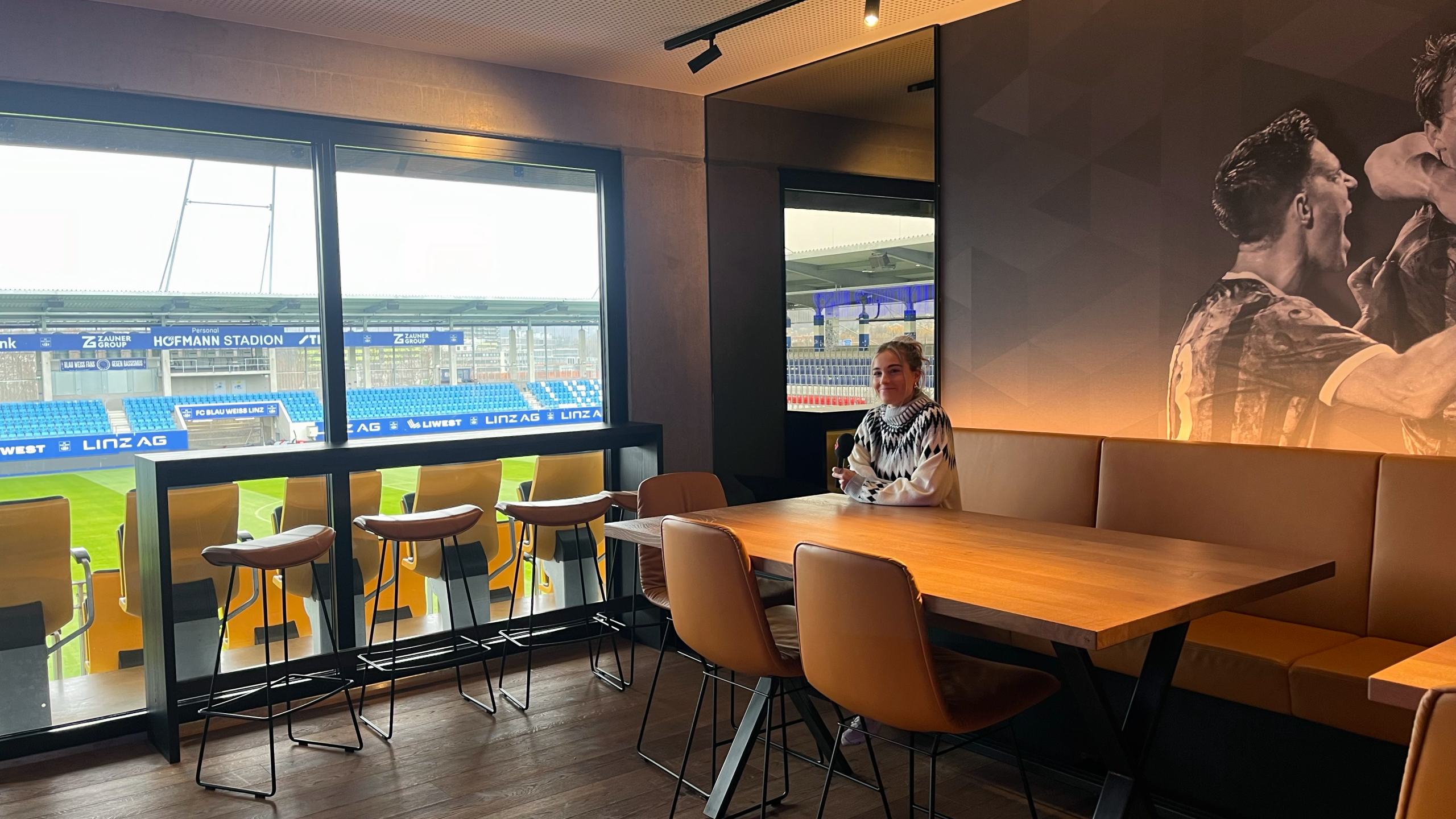 Nachdem wir einmal rund ums Stadion spaziert waren, den Blick über die Donau genossen und endlich den Eingang gefunden hatten, führte uns ein modernes Stiegenhaus im Beton-Loft-Stil ins Innere.