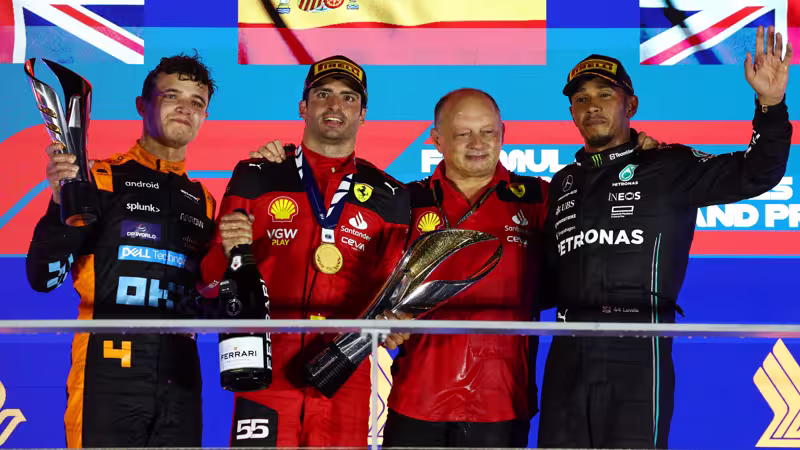 The Independent: "Ferraris Carlos Sainz schlägt Lando Norris und die taktischen Spielchen von Mercedes in einem frenetischen Finale beim Großen Preis von Singapur und beendet Red Bulls Versuch, zu den 'Unschlagbaren' zu werden."