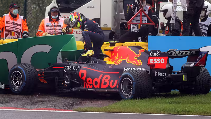 Der Mexikaner setzt sein Auto in Les Combes bei nassen Bedingungen in die Bande. Das Team bestätigt gegenüber Rennleiter Michael Masi, dass die Beschädigungen für eine Reparatur zu stark sind.