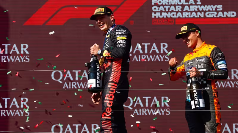 Der Brite schlug seine Champagnerflasche so kräftig auf das Podium, dass der Pokal von Max Verstappen von der obersten Stufe auf den Boden fiel. "Max hat ihn zu nah an den Rand gestellt. Und dann ist er runtergestürzt. Ist nicht mein Problem, ist ja seiner", kommentierte der McLaren-Pilot später mit verschmitztem Lächeln die Szene.