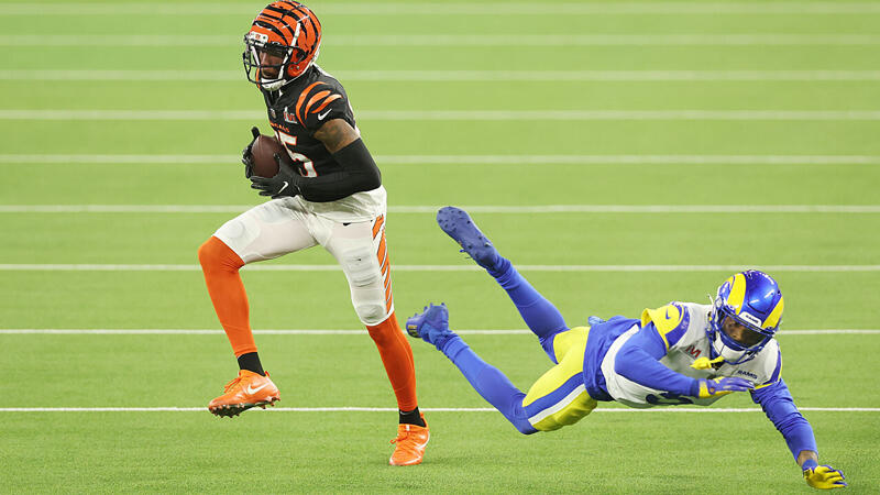 Die Bengals-Offense zeigt erst gegen Ende des ersten Viertels, warum sie einen derart guten Ruf genießt. Nach einem guten Rush von Joe Mixon zeigt Ja'Marr Chase der Welt, warum er zum Offensive Rookie des Jahres gewählt wurde, indem er gegen Superstar-Cornerback Jalen Ramsey einen herrlichen Catch hinlegt.