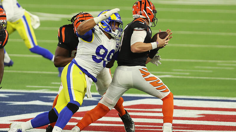 Fast wären es 8 geworden, wenn man sich den letzten Spielzug ansieht. Wieder mal war Aaron Donald durch, und wie schon gegen die 49ers beendete er das Spiel, als er den QB zu Boden brachte. Auch Joe Burrow brachte den Ball noch weg, doch dieses Mal fand der Ball weder Freund (Bengal) noch Feind (Ram).