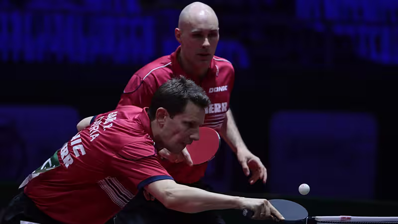 Die an Nummer fünf gesetzten Titelverteidiger unterliegen den auf Position drei eingestuften Ungarn Adam Szudi/Nandor Ecseki glatt mit 0:3 (-9,-9,-8) und verpassen eine Medaille im Doppel-Bewerb.