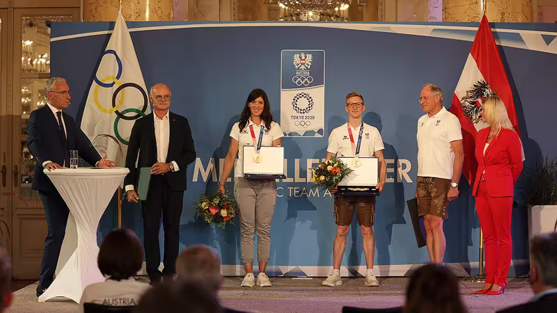 Als Belohnung für das Geleistete erhielt Kiesenhofer von ÖOC-Chef Karl Stoss Philharmoniker-Münzen im Wert von 17.000 Euro überreicht. Für Silbermedaillengewinnerin Polleres gibt es 13.000, die fünf Bronzenen Magdalena Lobnig, Bettina Plank, Shamil Borchashvili, Weißhaidinger und Schubert erhielten je 11.000. ÖOC-Präsident Stoss betonte, dass Österreich unglaublich stolz auf seine Sportler sein dürfe. "Das hat eine Feier verdient."