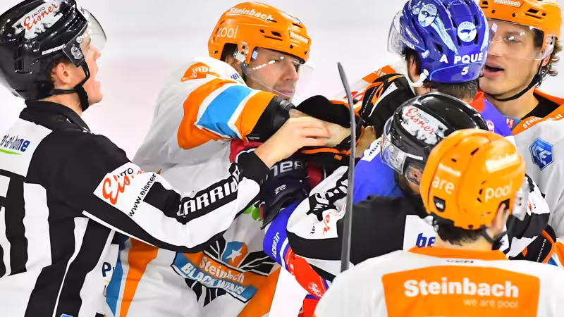 Zeit 35:05: Haie-Verteidiger Ben Betker erhält zwei Minuten wegen Roughing, die Linzer, die gerade nach einem 0:3-Rückstand zwei Tore erzielt haben, sind am Drücker.
