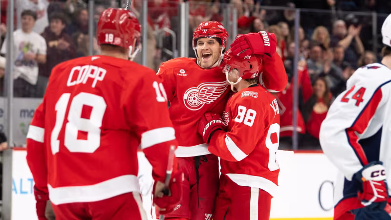Dylan Strome (50.) und Declan Chisholm (55.) bringen Washington aber zwei Tore in Führung. Dank zweier Treffer von DeBrincat (59. & 60.) retten sich die Red Wings in die Overtime. Diese verläuft torlos, entscheidend ist daher, dass Dylan Larkin seinen Penalty-Versuch für die Red Wings nicht im Tor unterbringt.