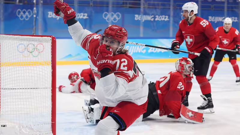 Der Caps-Stürmer erzielt beim 5:3 Dänemarks, bei dem auch KAC-Goalie Sebastian Dahm das Tor hütet, über die Schweiz den Gamewinner zum zwischenzeitlichen 4:1 (42.).