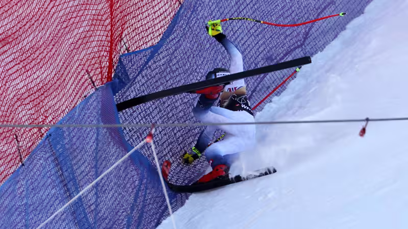 Der Norweger, aufgrund einer Verkühlung ohnehin leicht angeschlagen, verliert am Ende der längsten Strecke im Ski-Weltcup die Kontrolle und kracht in der Zielkurve ins Sicherheitsnetz.